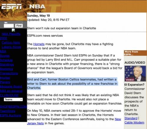 回到夏洛特这边,在黄蜂搬迁之后,NBA承诺会给夏洛特市带来一支NBA球队,并表示如果球馆问题可以快速解决,最早在2004-05赛季就能让新球队落地。