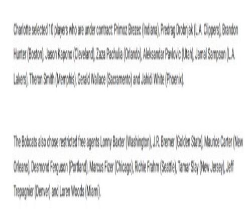 山猫队最终在扩张选秀中,选择了10名有合同在身的球员,和9名受限制自由球员。