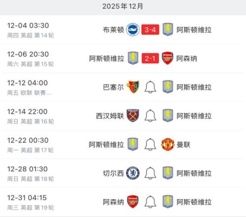 维拉12月剩余赛程:下旬将连续面对曼联、切尔西和阿森纳