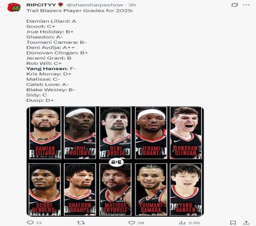 开拓者媒体Ripcityy为开拓者众将的2025年进行了评分:(杨瀚森是最差的那个)
